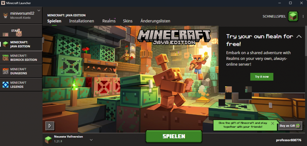 So sieht der Minecraft Launcher aus, wenn ihr euch angemeldet und die Minecraft Java Edition Version 1.21.8 heruntergeladen habt.