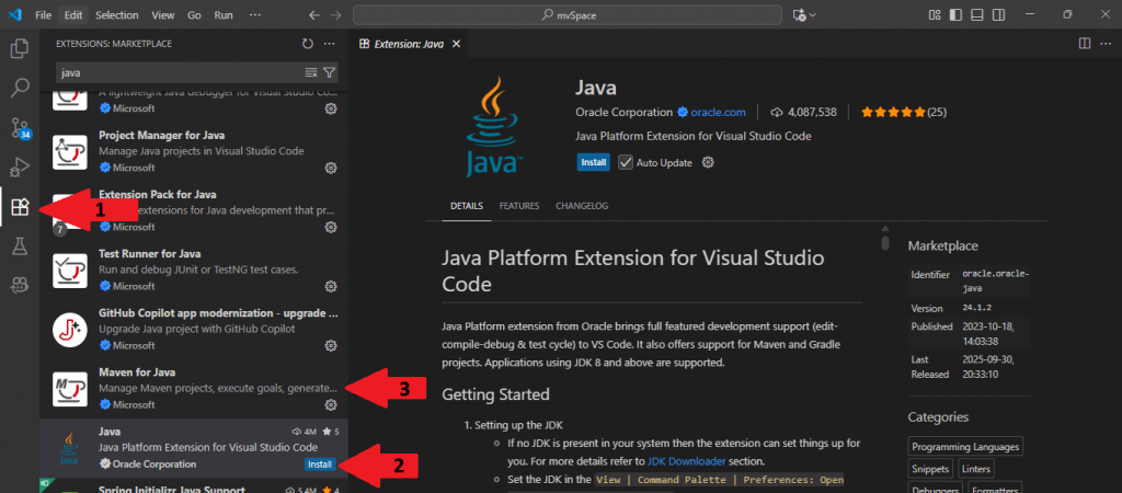 Tipp: Die Erweiterungen könnt ihr im VS Code über das Puzzle-Symbol links finden. Gibt „Java“ in das Suchfeld oben ein. Wählt die Plugins und klickt jeweils auf „Install“.